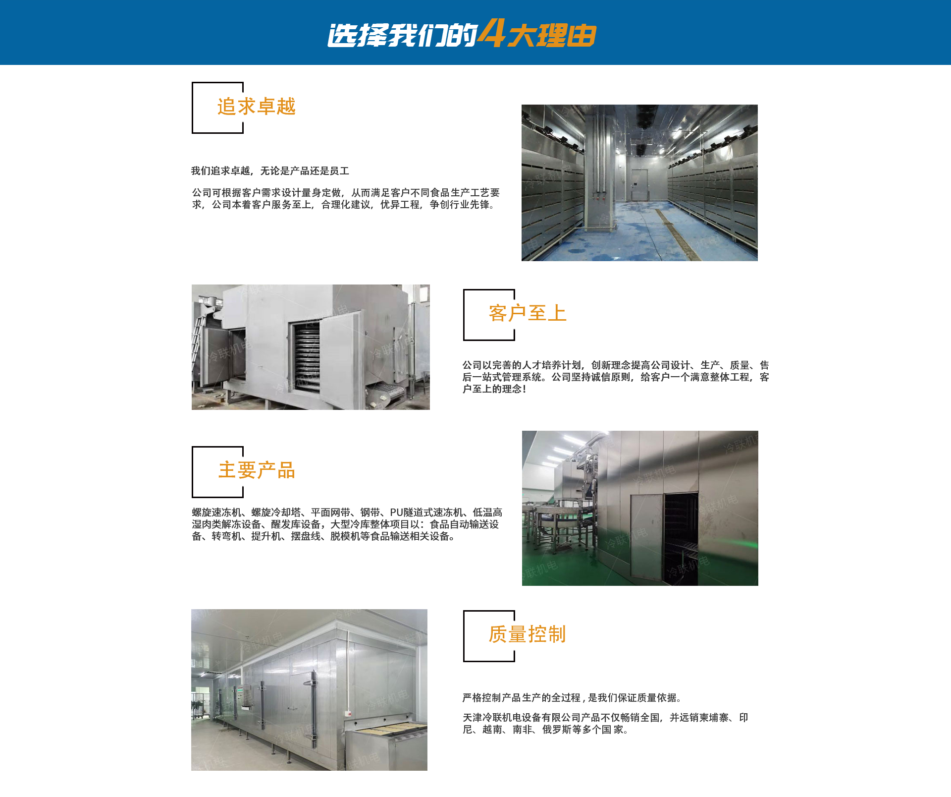 天津冷聯(lián)機(jī)電設(shè)備有限公司,是集科研、設(shè)計(jì)、制造、安裝、售后為一體的食品制冷機(jī)械公司。天津冷聯(lián)機(jī)電設(shè)備有限公司以生產(chǎn)制造速凍設(shè)備,冷卻設(shè)備。制冷工程,食品輸送線,肉類解凍設(shè)備為主的企業(yè)。公司坐落于天津市津南區(qū)咸水沽鎮(zhèn)海河工業(yè)園。公司可根據(jù)客戶需求設(shè)計(jì)量身定做,從而滿足客戶不同食品生產(chǎn)工藝要求,公司本著客戶服務(wù)至上,合理化建議,優(yōu)異工程,爭(zhēng)創(chuàng)行業(yè)先鋒。天津冷聯(lián)機(jī)電設(shè)備有限公司主要產(chǎn)品:螺旋速凍機(jī)、螺旋冷卻塔、平面網(wǎng)帶、鋼帶、PU隧道式速凍機(jī)、低溫高濕肉類解凍設(shè)備、醒發(fā)庫(kù)設(shè)備,大型冷庫(kù)整體項(xiàng)目以:食品自動(dòng)輸送設(shè)備、轉(zhuǎn)彎?rùn)C(jī)、提升機(jī)、擺盤線、脫模機(jī)等食品輸送相關(guān)設(shè)備。天津冷聯(lián)機(jī)電設(shè)備有限公司產(chǎn)品銷往各地,遠(yuǎn)銷柬埔寨、印尼、越南、南非、俄羅斯等多個(gè)國(guó)家。公司以完善的人才培養(yǎng)計(jì)劃,創(chuàng)新理念提高公司設(shè)計(jì)、生產(chǎn)、質(zhì)量、售后管理系統(tǒng)。公司堅(jiān)持誠(chéng)信原則,給客戶一個(gè)滿意整體工程,客戶至上的理念!